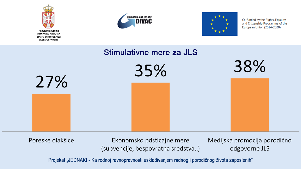 - Na pitanje o tome koje bi konkretne aktivnosti država trebalo da preduzme kako bi ih stimulisala da aktivno učestvuje u sprovođenju mera u vezi sa usklađivanjem rada i roditeljstva, najveći procenat JLS koje su učestvovale u anketi (37,8 odsto) odgovorio je da bi medijska promocija porodično odgovornih gradova ili opština mogla da bude značajna stimulativna mera. Na drugom mestu su ekonomski podsticaji, podržani od 35,2 odsto ispitanika, dok 27 odsto njih smatra da bi poreske olakšice učinile da se veći broj JLS angažuje oko aktivnijih mera usmerenih na porodice i njihovo poslovno okruženje, navodi Bjelobrk.