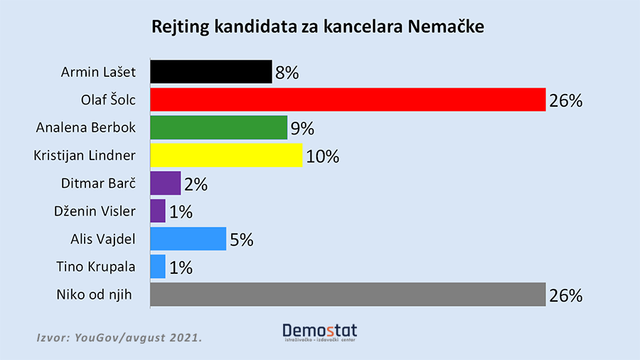 Što se tiče “pretendenata” na kancelarsku funkciju, navedeno istraživanje javnog mnjenja pokazalo je da je kandidat socijaldemokrata Olaf Šolc sve popularniji, dok  njegov rival iz redova CDU/CSU Armin Lašet “gubi poene”. Za Šolca se izjasnilo 26 odsto ispitanika, a drugoplasirani je trenutno liberal Kristijan Linder (podrška od 10 odsto), dok je “uzdanica” Zelenih Analena Berbok treća, sa podrškom od devet odsto. Za pomenutog Lašeta izjasnilo se svega osam odsto ispitanika. Preostala mesta pripala su Alis Vejdel iz Alternative za Nemačku, koju je podržalo pet odsto anketiranih, dok se za njenog stranačkog kolegu Tina Krupalo izjasnio jedan odsto ispitanika. Isti rejting (jedan odsto) ima i Žanin Visler, predstavnica Levice, dok je njen partijski “drug” Ditmar Barč bolje rangiran, budući da ga je podržalo dva odsto anketiranih.  Čak 26 odsto ispitanika s pravom glasa izjavilo je da ne bi podržalo izbor nijednog od pomenutih osmoro kandidata.