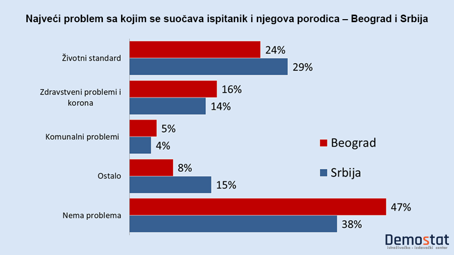 Na uzorku građana Srbije (prva polovina novembra) našli smo da 62 posto ispitanika navodi probleme, dok 38 posto izjavljuje da nema većih problema. Problemi se najčešće vezuju za životni standard (29 posto), bolest i koronu (14 posto) a potom slede nezaposlenost, komunalni problemi, problemi vezani za funkcionisanje vlasti… Socio-demografske varijable ne diferenciraju značajnije konstataciju o postojanju ili nepostojanju problema, osim kod onih varijabli koje su direktno povezane sa standardom kao najčešće navođenim problemom, kao što su finansijsko stanje porodice i radni status ispitanika. Na primer, 75 posto prekarnih radnika tvrdi da ima problema, a 25 posto da nema; 70 posto nezaposlenih radnika tvrdi da ima problema, a 30 posto da nema.