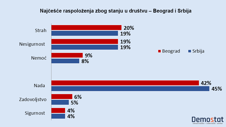 Među svih šest raspoloženja dominira nada da će biti bolje (44 posto), a potom izjednačena nesigurnost (19 posto) i zabrinutost i strah (18 posto) - oni skupa čine četiri petine svih ispitanih raspoloženja.