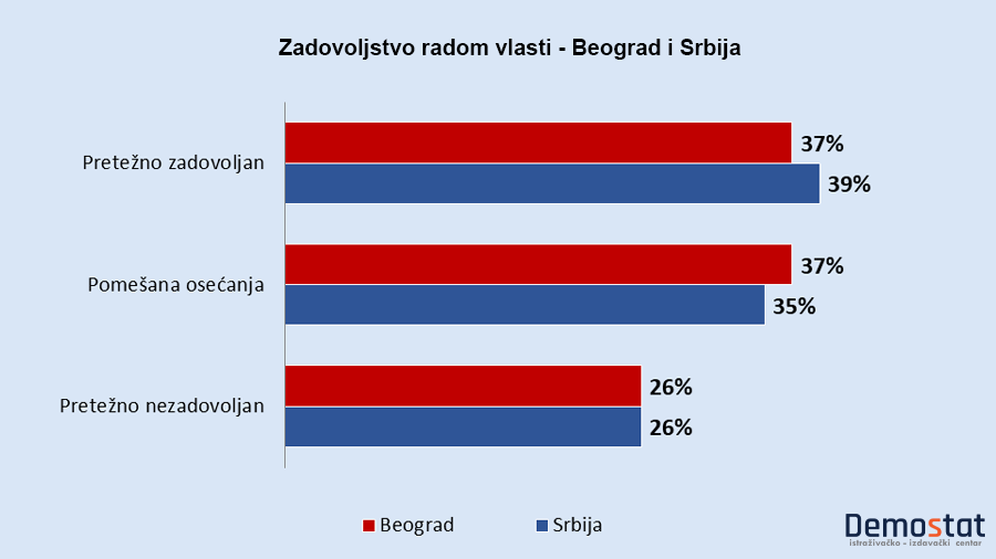 Dve petine građana Srbije je zadovoljno vlašću, četvrtina je nezadovoljna, a trećina je malo zadovoljna, malo nezadovoljna. Ako ove polovično ne/zadovoljne podelimo na zadovoljne i nezadovoljne, dobijamo ovakvu proporciju zadovoljnih i nezadovoljnih: 57 posto je zadovoljno a 43 posto je nezadovoljno onim šta i kako radi vlast. Tako je gotovo isto i u istraživanju u regionu Beograd.