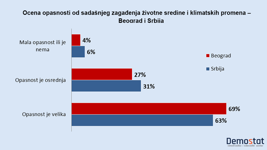 Samo šest posto ispitanika ocenjuje opasnost od zagađenja životne sredine i klimatskih promena kao nikakvu ili malu, 31 posto kao osrednju, a 63 posto kao veliku. Postoji razlika u oceni opsnosti između vladajućih stranaka (49 posto) i partija u opoziciji koje u znatno većem broju naglašavaju opasnost: koalicija SSP i drugi (95 posto), Zeleno-leva koalicija (70 posto)... Značajno je što većina svih ispitanika vidi opasnost, uključiv tu i pristalice SNS i drugih i što je to jedna od fokusnih tema opozicionih partija, dok je vlast nosilac prakse koja je suprotna ekološkim ciljevima.