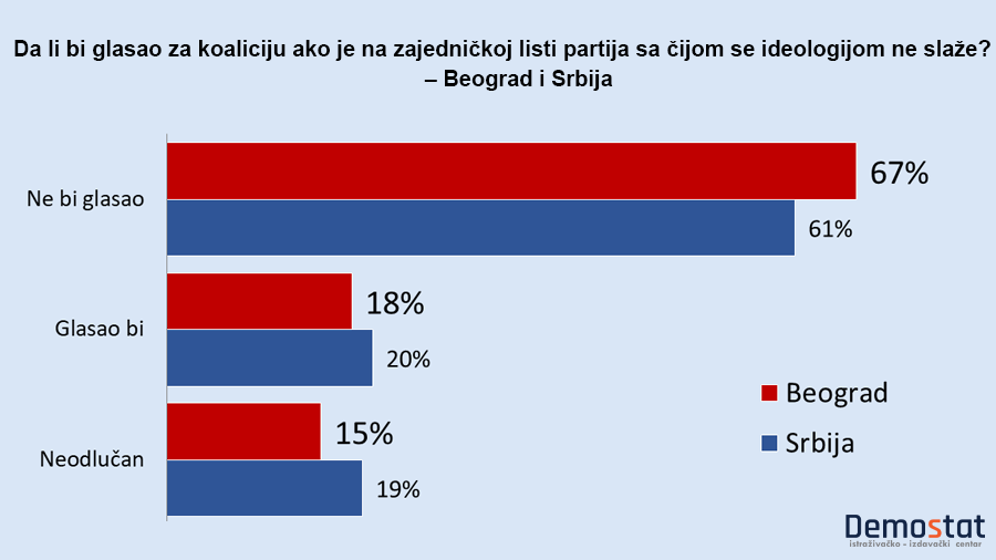 Evo kako predizborna konfuzija izgleda na primeru povezivanja odgovora o ne/spremnosti da se glasa za koaliciju ako se u njoj nađe neka partija sa čijom se ideologijom dati građani ne slažu, a istovremeno se tvrdi da je za opoziciju najbolje da izađe u jednoj koloni. Tri petine ispitanika smatra da je bolje da se izađe u jednoj koloni, a dve trećine neće da glasa za opozicionu koaliciju ako u njoj ima partija sa kojom se oni ideološki ne slažu. I direktno, ima ukupno 46 posto ispitanika koji kažu da je bolje izaći u jednoj koaliciji a ti isti ispitanici kažu da neće da glasaju ako u toj koaliciji ima partija sa kojom se oni ideološki ne slažu. Proizlazi, da bi gotovo polovina ispitanika glasala samo za koaliciju u kojoj su ideološki istomišljenici. Poređenje ove „želje“ opoziciono nastrojenih građana sa ideološkim registrom opozicionih stranaka, pokazuje neostvarivost pomenute „želje“ (jer, i uz veliko međusobno razumevanje opozicionih lidera, u najboljem slučaju verovatna su najmanje četiri opoziciona bloka). Uz sve ovo imamo i nalaz koji govori o tome kako većina građana opoziciono orijentisanih smatra da je bitno da se opozicija dogovori, a ne u koliko će kolona izaći. Ostaje pitanje, ko će imati veći uticaj na onaj konfuzni deo opozicionog javnog mnenja, vladajuće partije, njihovi mediji, njihove paramilitarne grupe ili partije opozicije koliko-toliko objedinjene oko nekoliko zajedničkih ciljeva.