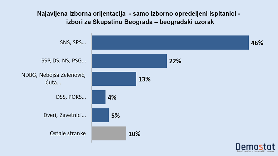 U beogradskom uzorku (istraživanje krajem oktobra i početkom novembra), u strukturi izborno opredeljenih (znači, bez apstinenata i sličnih) na izborima za Skupštinu Beograda, možemo razlikovati najmanje tri grupe građana: