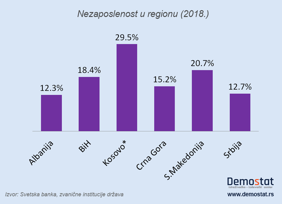 Uprkos rastu, u 2018. godini je stvoreno manje radnih mesta. Najniža stopa nezaposlenosti je bila u Albaniji, a najveća na Kosovu sa 29.5 odsto nezaposlenog stanovništva. Zaposlenost u Srbiji dostigla je novi maksimum sa 47,6 odsto, što je porast od 0,9 procenata. Ipak, širom Zapadnog Balkana, nezaposlenost je najveća briga građana jer više od 33 odsto ispitanika cele regije i dalje to navodi kao glavni problem u svojoj državi.