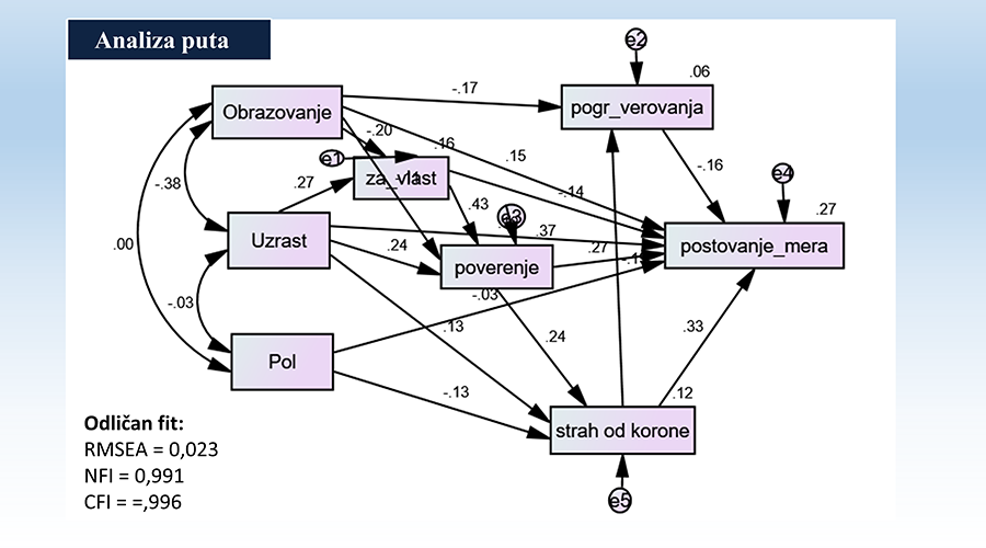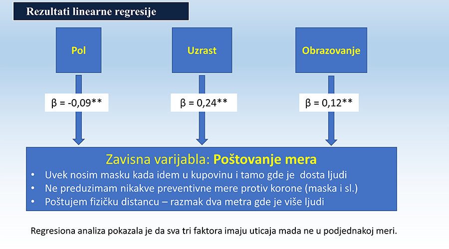 Na veze između demografskih faktora i poštovanja propisanih mera delimično je uticalo i poverenje u vlasti, podrška vladajućoj partiji, strah od Kovida 19 i prihvatanje zabluda i dezinformacija koje se plasiraju, a sve to modifikovano delovanjem medija i kampanja.