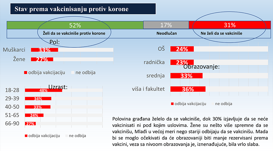 Kako je pokazalo istraživanje, polovina građana želelo bi da se vakciniše, dok 30 odsto izjavljuje da se neće vakcinisati ni pod kojim uslovima. Mlađi u većoj meri nego stariji odbijaju da se vakcinišu (48 odsto ). Mada bi se moglo očekivati da će obrazovaniji biti manje rezervisani prema vakcini, veza sa nivoom obrazovanja je, iznenađujuće, bila vrlo slaba. Tako se ne bi vakcinisalo 24 odsto ispitanika koji imaju završenu samo osnovnu školu, dok je taj procenat među visokoobrazovanima znatno viši, čak 36 odsto.
