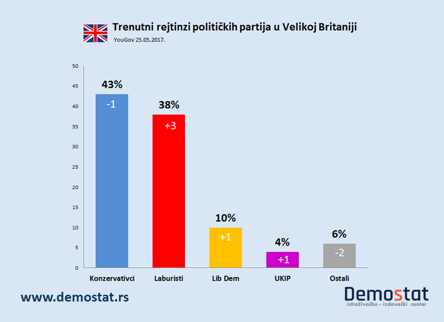 Ankete rađene neposredno pre napada u Londonu, a nakon napada u Mančesteru, konzervativcima su davale prednost od 5 odsto u odnosu na laburiste (43% prema 38%). Dok je istraživanje, objavljeno nedelju dana pre napada u Mančesteru, Konzervativnoj partiji davalo je podršku od 44%, a Laburističkoj partiji 35%.