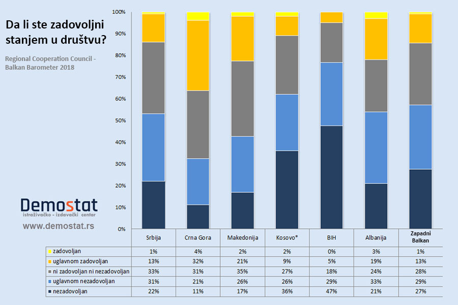 Sto se tiče opšteg stanja u društvu zemalja Zapadnog Balkana, najnezadovoljniji su građani BIH (5% je zadovoljno), dok su Crnogorci najzadovoljniji (36% je zadovoljno). Ako se pogleda ceo Zapadni Balkan 14% građana je zadovoljno dok je 56% nezadovoljno stanjem u društvu.