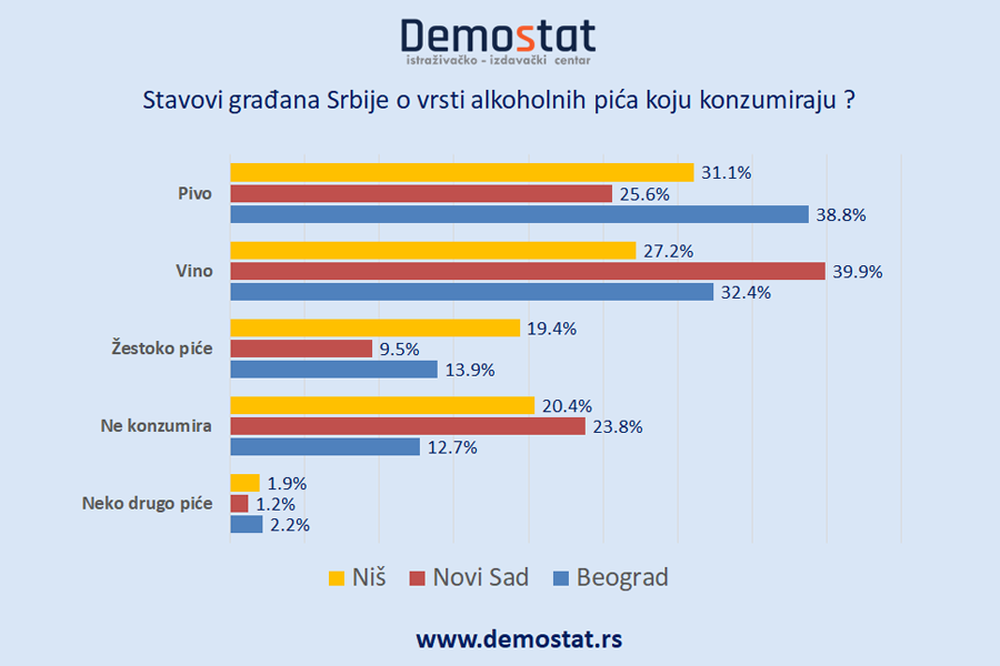 Izdvajanjem i upoređivanjem tri velika grada Beograda, Niša i Novog Sada, pivo se najviše konzumira u Beogradu, potom u Nišu, dok se vino najviše pije u Novom Sadu pa onda u Beogradu. Žestoka pića najviše se konzumiraju u Nišu, tek onda u Beogradu.