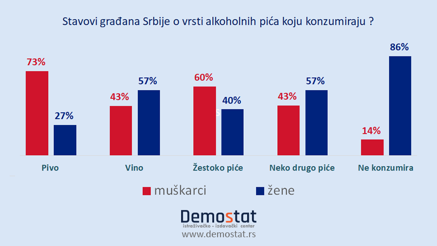 Od ukupno 21,9 odsto ispitanika koji su rekli da ne piju alkohol uopšte većina su žene, čak 86 odsto, svega 14 odsto odgovora da ne konzumiraju alkoholna pića dali su muškarci. Omiljeno alkoholno piće kod trećine žena je vino, pokazalo je istraživanje, dok se gotovo polovina muškaraca odlučuje za pivo (49 odsto).