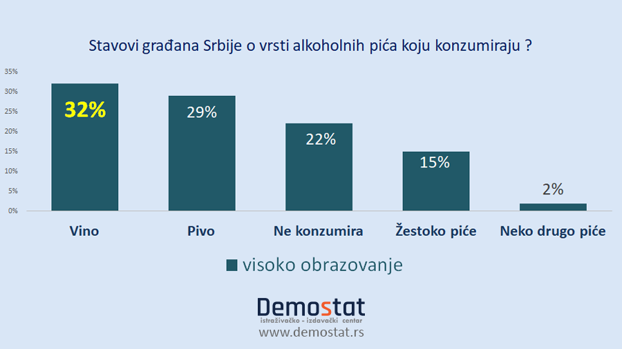 Istraživanje je pokazalo i da ispitanici sa visokim i višim obrazovanjem najviše konzumiraju vino 32 odsto, potom pivo 29 odsto, 15 odsto žestoka pića, dva odsto ostala pića, dok 22 odsto njih ne konzumira alkohol.