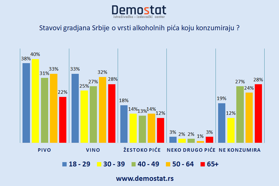 Petina isptanika u istraživanju koje je urađeno tokom oktobra ove godine reklo je da ne konzumira alkohol uopšte, dok se za pivo kao prvi izbor odlučilo 32,8 odsto ispitanika, 28,9 odsto njih je reklo da preferira vino, za “žestinu” se odlučilo 14,3 odsto, dok je 2,1 odsto njih odabralo neko drugo alkoholno piće.