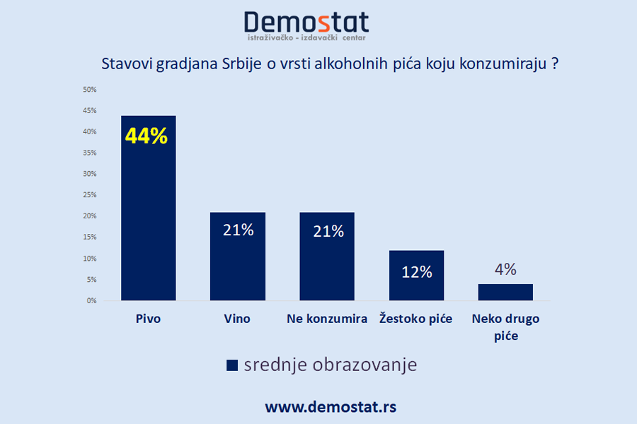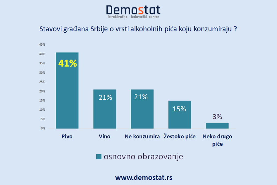 Srednje obrazovani ispitanici najčešće biraju pivo (44 odsto), duplo manje vino 21 odsto, za žestoka pića odlučuje se 12 odsto njih, četiri odsto bira ostala pića, a 21 odsto je reklo da ne pije. Isti redosled je i kod onih koji imaju osnovno obrazovanje, s tim što pivo pije 41 odsto njih, dok se za vino odlučuje 21 odsto.