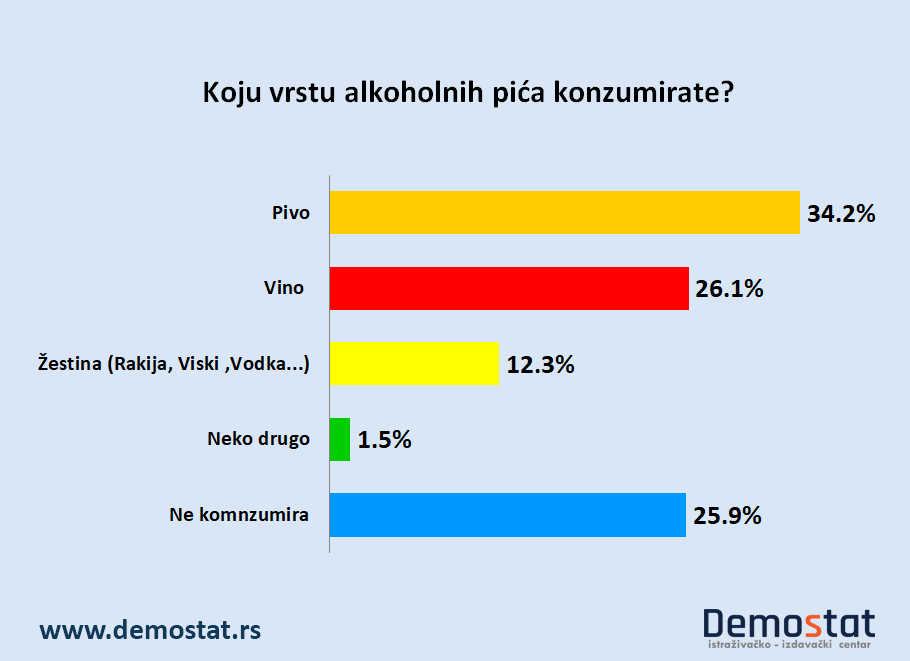 Istraživanje koje je od 1. do 7. oktobra, na reprezentativnom uzorku od 1.478 ispitanika, sproveo Istraživačko-izdavački centar "Demostat", pokazuje da je među alkoholnim pićima na mestu broj jedan pivo sa 34,2 odsto, sledi vino sa 26,1 odsto dok su na trećem mestu plasirana takozvana žestoka pića (među njima i rakija), sa 12,3 odsto ostvarenih u istraživanju.