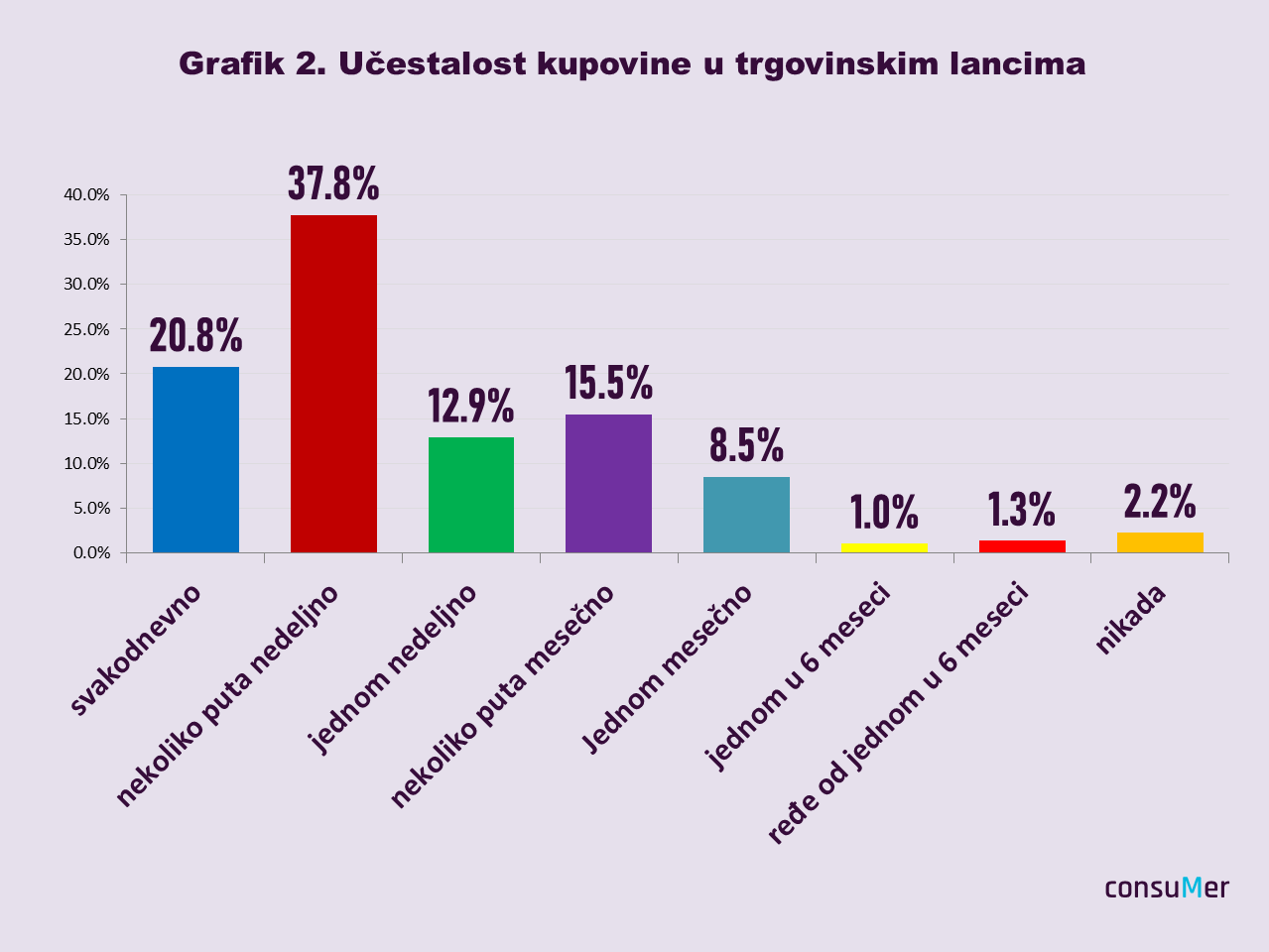 Koliko česo kupujete u trgovinskim lancima? To je bilo pitanje iz ankete na koje je ponuđeno osam odgovora (svakodnevno; nekoliko puta nedeljno; jednom nedeljno; nekoliko puta mesečno; jednom mesečno; jednom u šest meseci; ređe od jednom u šest meseci; nikada.