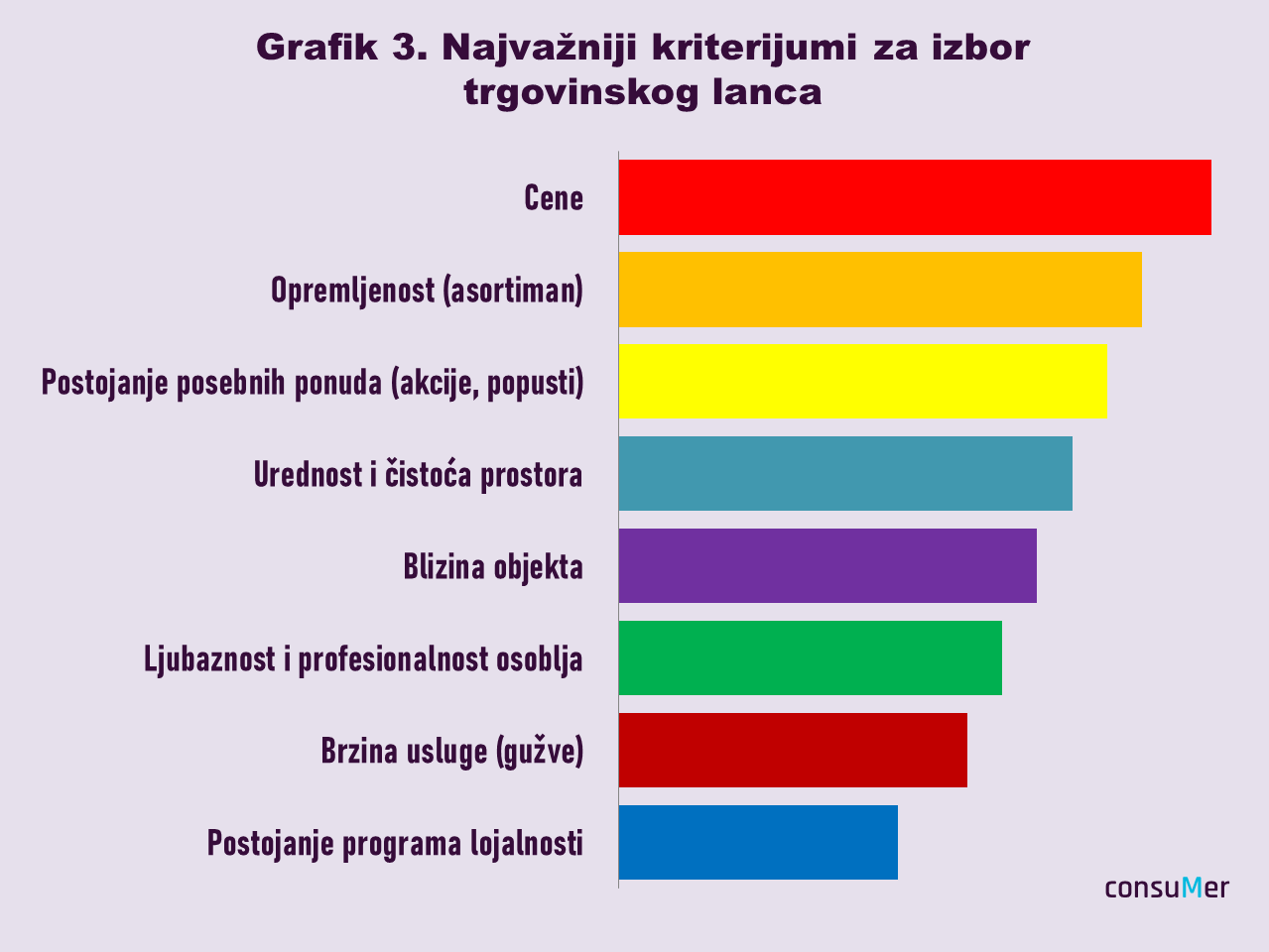 Jedan od rezultata iz ovog seta je da su cene ubedljivo na prvom mestu razloga za izbor lanca u kome će se snabdevati i to kod svih kategorija ispitanika, a naročito kod kupaca sa osnovnom školom, koji žive u seoskoj sredini, u Južnoj i Istočnoj Srbiji ili Zapadnoj Srbiji i Šumadiji. Nešto je niži stepen važnosti ovog kriterijuma, ali i dalje na prvom mestu, kod potrošača sa srednjom školom koji žive u gradskoj sredini ili u Beogradu, kao i među kupcima starosti između 40 i 49 godina. Sledi raznovrsnost asortimana (opremljenost) koja je najčešće važan razlog za odabir trgovine a treći najvažniji faktor su posebne ponude (akcije) kojima se najčešće rukovode žene, fakultetski obrazovani kupci i građani u dobi od 50 do 64 godine. Za privlačenje kupaca najamnje je interesantan program lojalnosti koji nudi većina lanaca. (Grafik 3)
