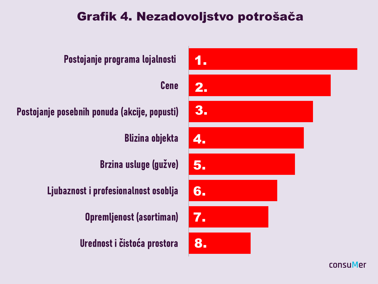 Zadovoljstvo potrošača mereno je njihovim odgovorom na zahtev da ocene svaki od kriterijuma za izbor lanca. Sudeći po rezultatima, najmanje su zadovoljni cenama i programima lojalnosti, upravo kriterijumima koji ih najčešće opredeljuju za kupovinu u nekoj trgovini, dok su najzadovoljniji snabdevenošću, te uređenošću i čistoćom prostora (Grafik 4).