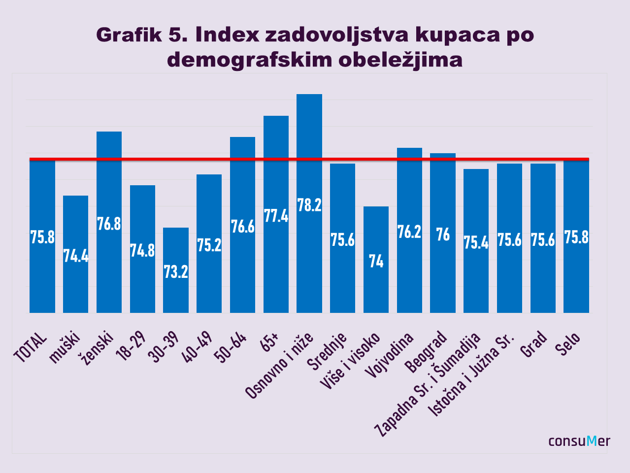 Na osnovu svih podataka dobijenih u anketi koji su pretočeni u numeričke vrednosti, prema važećoj metodologiji dobija se indeks zadovoljstva potrošača (ZAP) koji u proseku iznosi 75,8 jedinica. Međutim, postoje značajna odstupanja koja pokazuju da neke od kategorija stanovništva imaju veći ili manji indeks, pri čemu je od velikog značaja svaka iskazana jedinica indeksa (Grafik 5). Tako najmanji stepen zadovoljstva pokazuju osobe od 30 do 39 godina (73,2), visokog ili višeg obrazovanja (74) kao i potrošači muškog pola (74,4). Značajno iznad proseka zadovoljstva su kupci sa osnovnom i nižom školom (78,2), stariji od 65 godina (77,4), osobe ženskog pola (76,8), generacija od 50 do 64 godine (76,6) i građani Vojvodine (76,2).