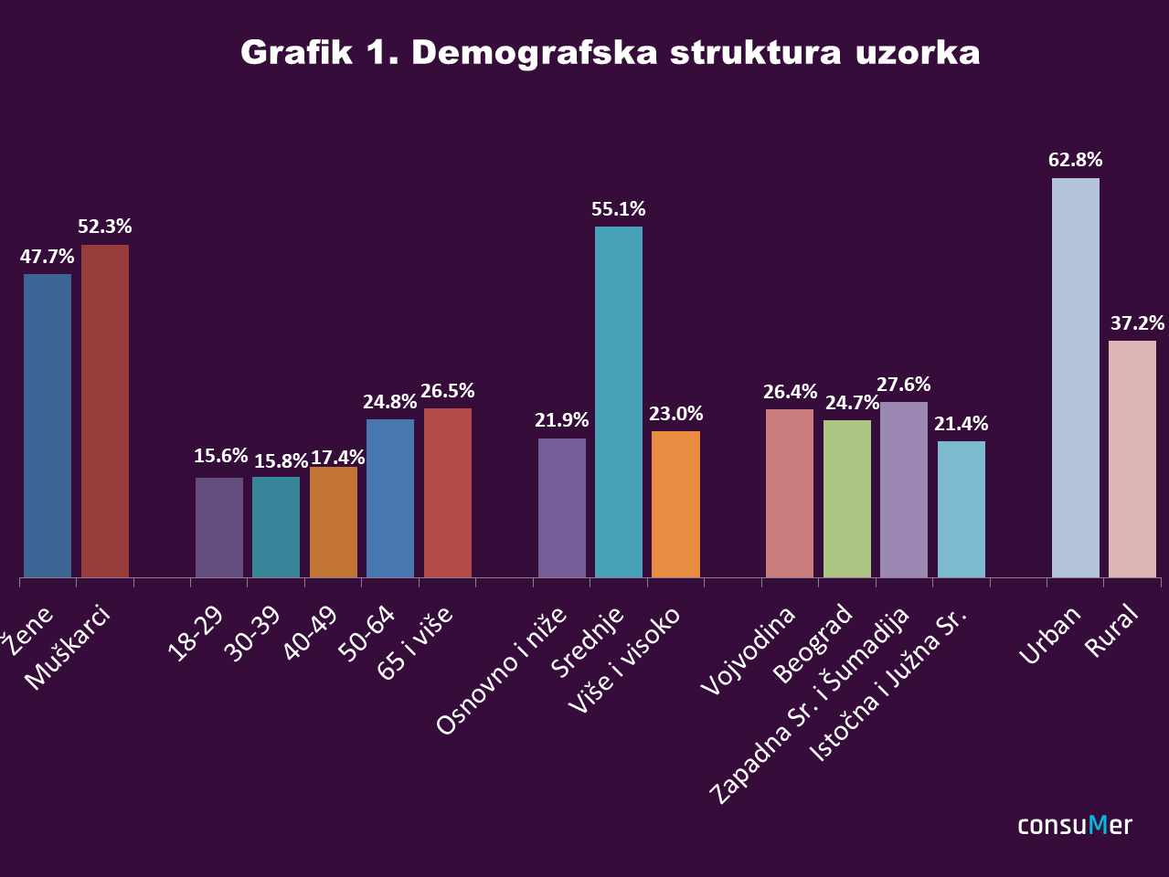 Izveštaj o stepenu zadovoljstva potrošača kreiran je na osnovu podataka prikupljenih putem ankete na reprezentativnom uzorku od 1024 punoletna građanina Srbije, telefonskim anketiranjem (50% uzorka je realizovano zvanjem fiksnih telefona, a 50% zvanjem mobilnih telefona). Poststratifikacija uzorka je vršena u skladu sa populacionim parametrima utvrđenim popisom 2022, na osnovu obrazovanja i ukrštenih varijabli: pola, starosti, regiona i tipa naselja, tako da uzorak ima strukturu kao i populacija (Grafik 1).