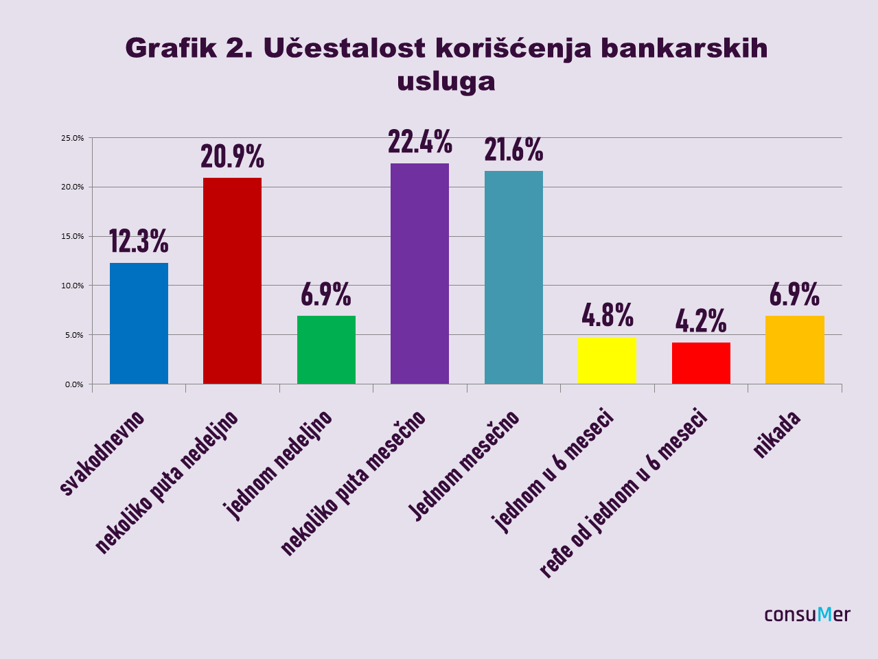 Na pitanje “Koliko često koristite bankarske usluge”, što je podrazumevalo ne samo fizičke odlaske u banku nego i pozive korisničkom servisu, korišćenje e-banking i m-banking aplikacija ili izlazak na sajt banke, ispitanici su mogli da se opredele za jedan od osam odgovora (svakodnevno; nekoliko puta nedeljno; jednom nedeljno; nekoliko puta mesečno; jedenom mesečno; jednom u šest meseci; ređe od jednom u šest meseci ili nikada (Grafik 2).
