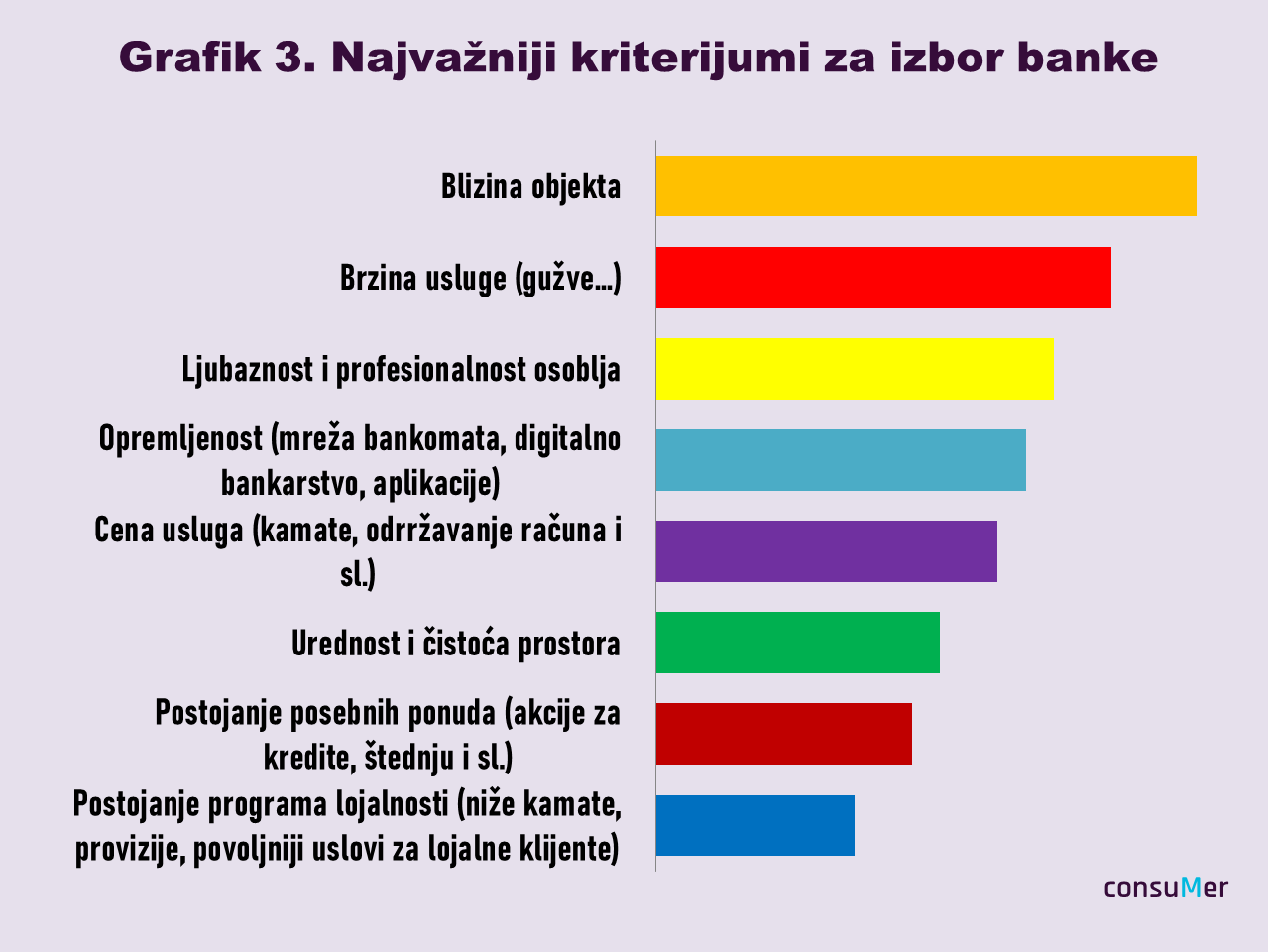 Na koji način se opredeljujemo za određene banke, razjasnilo je rangiranje kriterijuma po važnosti za izbor, pa su ispitanici ocenom 1 označili onaj koji smatraju najažnijim a sa 8 onaj koji im je najmanje važan. Tako najmanji broj “bodova” dobija razlog koji klijenti smatraju najvažnijim (Grafik 3).