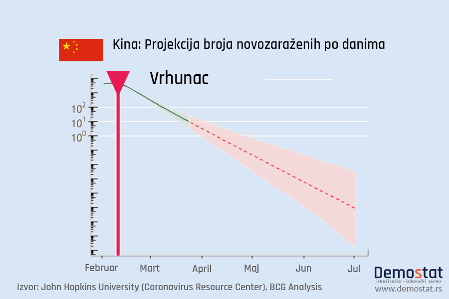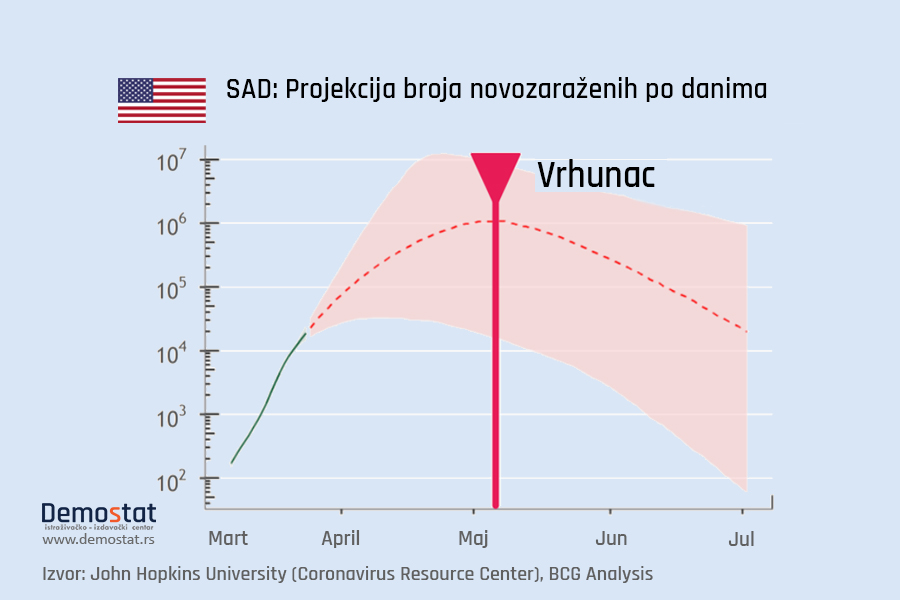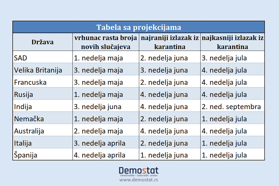 Ove modele razvoja pandemije i odgovora država na krizu je, na osnovu do sada dostupnih podataka, izradila američka konsultantska kompanija „Boston consulting group“ a Demostat je imao uvid u podatke te studije. Radi se o o predikcijama koje još uvek nisu objavljene za širu javnost i koje su izrađene sa napomenom da postoji još mnogo varijabli koje mogu da promene tok situacije. Procene su rađene 25. marta na osnovu BSG prediktivnog modela a koristeći podatke Džon Hopkins Univerziteta.