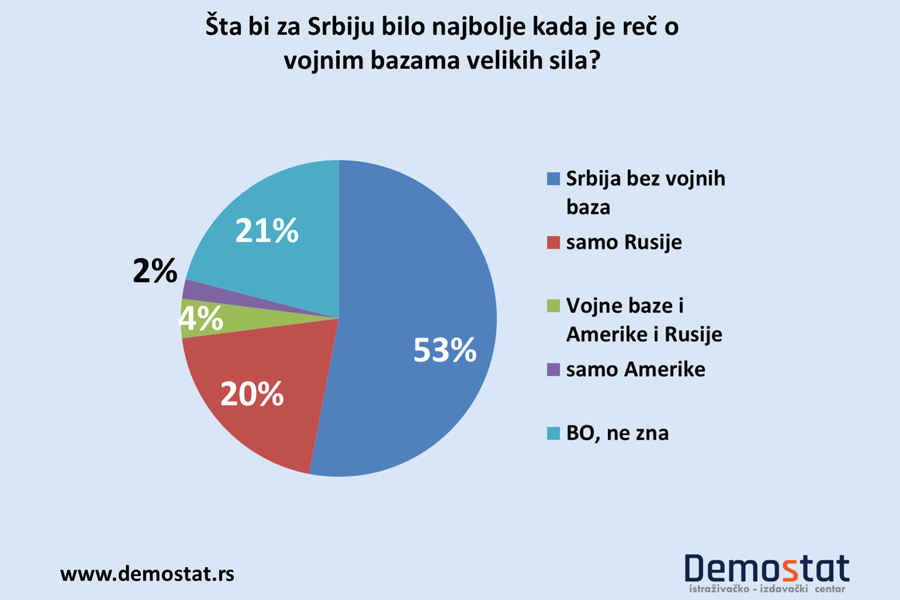 1) Natpolovičan broj ispitanika je za Srbiju bez vojnih baza (53%), a ako već mora da ih bude, onda je tu Rusija (20%).