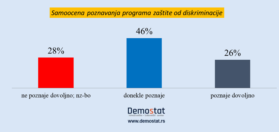 Odgovori ispitanika na pitanje o poznavanju programa zaštite od diskriminacije, pokazuju nomalnu raspodelu. Gotovo polovina ispitanika kaže da donekle poznaje, četvrtina kaže da dovoljno poznaje a tek nešto više izjavljuje da ne poznaje programe. – Verovatno ispitanici precenjuju svoje poznavanje programa zaštite od diskrimnacije. Oni svoje poznavanje diskriminacije uopšte i svoje iskustvo sa diskriminacijom ekspandiraju na poznavanje programa, iako taj program kao celovito i sistematsko društveno i institucionalno suprotstavljanje diskriminaciji gotovo i ne postoji osim u jednoj pravno-deskriptivnoj formi.