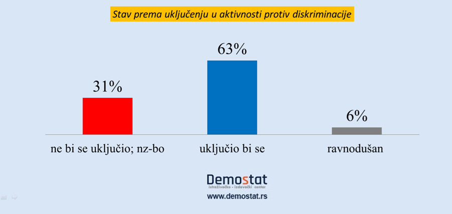 U našem istraživanju smo evidentirali sklonost velikog broja građana za uključenje u aktivnosti protiv diskriminacije. Gotovo dve trećine građana (63%) izjavljuje da bi se uključilo u aktivnosti protiv diskriminacije, dok je jedna trećina rezervisana prema tom aktivitetu.
