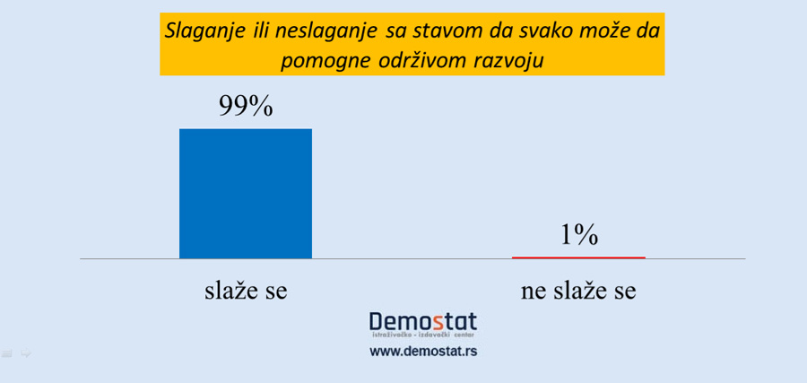 U specijalnom Evrobarometru broj 468 nalazimo odgovore ispitanika iz 28 zemalja EU o tome da li oni mogu imati neku ulogu u zaštiti okoline. Potpuno ili pretežno slaganje sa tvrdnjom karakteriše 87% ispitanika, a pretežno ili potpuno se ne slaže 11% ispitanika. – Mi smo u našem istraživanju pitanje o potencijalnom aktivizmu nešto drukčije formulisali: Da li se slažete ili ne slažete sa mišljenjem da svako od nas može da pomogne održivom razvoju, da na primer štedi struju, ne baca hranu, ne zagađuje okolinu? Evidentirali smo apsolutnu podršku doprinosu građana održivom razvoju.