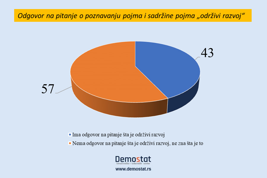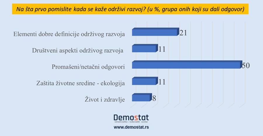 Građani Srbije su na pitanje Kad se kaže održivi razvoj, na šta prvo pomislite ili možda ne znate šta je to, dali sledeće odgovore: 57% ne zna šta je to, dok je 43% navelo neki odgovor. Približno petina svih ispitanika dalo je manje ili više tačan odgovor.
