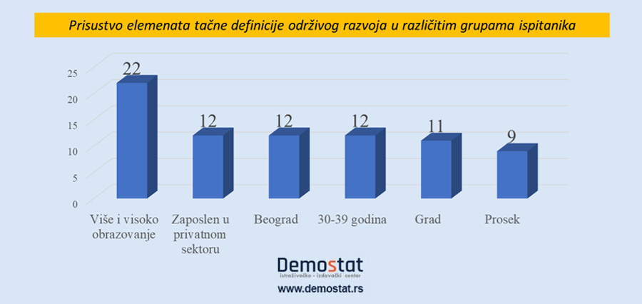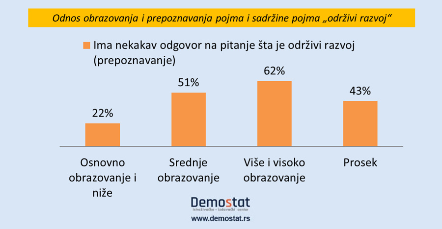 Obrazovniji građani češće od ostalih prepoznaju pojam održivog razvoja. Gotovo tri puta je više takvih među visokoobrazovanima nego među ispitanicima sa osnovnom školom ili manje. Iznenađujuće je, ipak, da gotovo dve petine visokoobazovanih nisu u stanju da prepoznaju pojam održivog razvoja (razlikujemo prepoznavanje od poznavanja – kao razlika između onih koji isle da znaju i onih koji znaju).