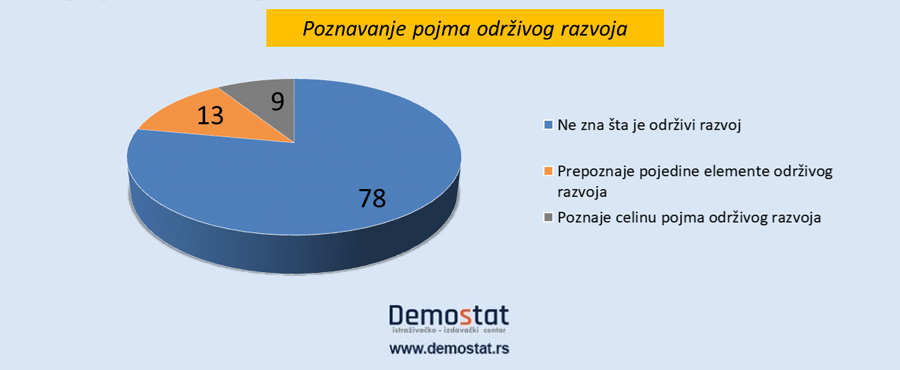 Ukoliko saberemo broj ispitanika koji ne znaju šta je održivi razvoj (57% od ukupnog uzorka) i one koji su dali pogrešne, uopštene i odgovore koji se ne mogu ni na koji način povezati sa suštinom održivog razvoja (oko 21% ukupnog uzorka) – moglo bi se zaključiti da je nepoznavanje održivog razvoja karakteristično za 78% ispitanika. Od 22% ispitanika koji su dali odgovore koji se mogu povezati sa održivim razvojem, 13% prepoznaje pojedine elemente održivog razvoja, a svega 9% prepoznaje celinu pojma održivi razvoj.