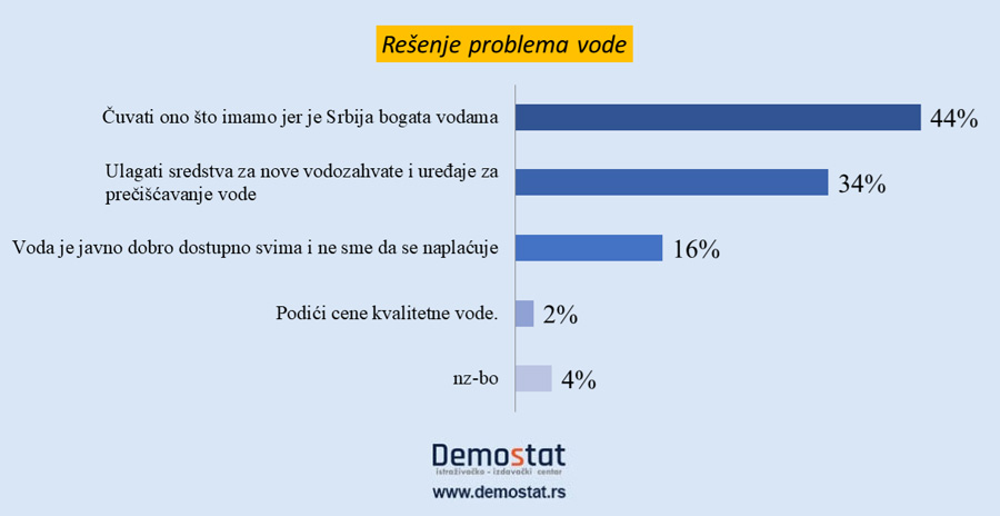 Na pitanje „Kako u Srbiji treba rešiti problem vode?“ ispitanicima su ponuđena četiri rešenja: čuvati ono što imamo, ulagati sredstva za nove vodozahvate, podići cenu vode i besplatna voda. – Poenta je bila u obrazloženju prvog ponuđenog odgovora: Čuvati ono što imamo jer je „Srbija bogata vodom“. Srbija pak nije bogata vodom, a pogotovu nije prebogata.