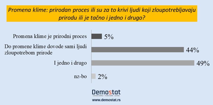 Generalno gledano, klimatske promene rezultat su kombinacije delovanja prirode i ljudskih aktivnosti. O tome svedoči američka studija u kojoj se kaže: „Stvarno stanje klime zavisi i od prirodnih promena i od promena koju izazivaju ljudi. Na dekadnom nivou ova dva faktora su podjednakog intenziteta“. Upravo tako misli i polovina naših ispitanika – 49% kaže da su klimatske promene rezultat delovanja dva faktora: delovanja prirode i delovanja ljudi koji tu prirodu zloupotrebljavaju. Tek nešto manje ispitanika (44%) za promenu klime optužuje one koji zloupotrebljavaju prirodu.