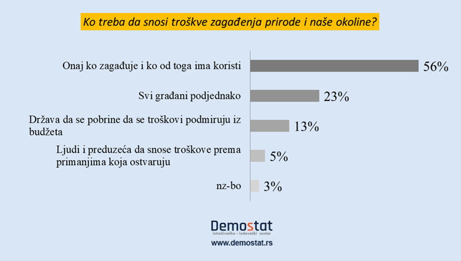 Jedan od nekoliko osnovnih principa održivosti odnosi se na to da zagađivači snose troškove loših posledica zagađenja: „Zagađivač/korisnik plaća“, a to se svodi na uključenje troškova vezanih za životnu sredinu u cenu proizvoda. Princip je princip, a praksa je praksa. Građani, pak, u ovom slučaju podržavaju princip, tj. većina građana smatra da zagađivači treba da snose troškove posledica proizvodnje zagađenja.