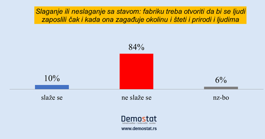 Pozitivan odnos prema ekološkim pitanjima smo testirali preko reakcije ispitanika na dilemu: ekologija ili zaposlenost. Test-pitanje je glasilo: Da li se slažete ili ne slažete sa mišljenjem da neku fabriku treba otvoriti da bi se ljudi zaposlili čak i kada ta fabrika zagađuje okolinu i šteti i prirodi i ljudima?- Čak 84% ispitanika ustvrdilo je da se ne slaže sa otvaranjem fabrike koja donosi zagađenje okoline i šteti ljudima, iako bi se na taj način zaposlio jedan broj nezaposlenih ljudi.