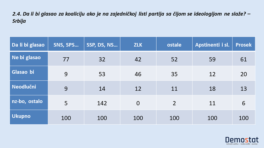 Ako odbijanje da se glasa za koalicija u kojoj je neka partija sa čijim programom se ispitanik ideološki ne slaže, uslovno shvatimo kao ideološku zagriženost, onda možemo da tvrdimo da je tri petine građana Srbije i dve trećine Beograđana ideološki zagriženo a to baš i nije podatak u koji bez dubljih istraživanja možemo da verujemo. Ipak, u pitanju je značajna indicija po kojoj su 77% pristalica vladajućih partija ideološki zagrižene (!!!), a takvi su i 59% apstinenata i neodlučnih, 52% pristalica partija koje u ovom trenutku ne prelaze cenzus, 42% pristalica ZLK i 32% pristalica političkog saveza SSP, DS, NS…
