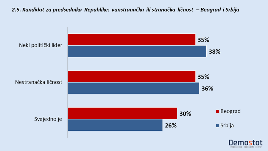 Podjednak broj građana Srbije misli da je bolje da predsednički kandidat bude politička ličnost (38%), odnosno da bude nestranačka ličnost (36%), a tu je i jedna četvrtina onih kojima je to manje-više svejedno.