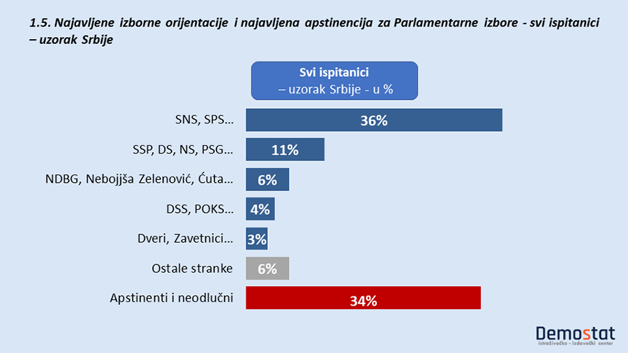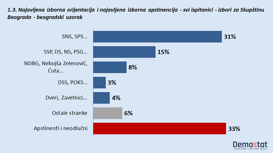 Uzimajući u obzir sve ispitanika iz uzorka za Beograd, partije opozicije imaju 36% pristalica, partije vlasti 31%, dok apstinenata i neizjašnjenih ima 33%.