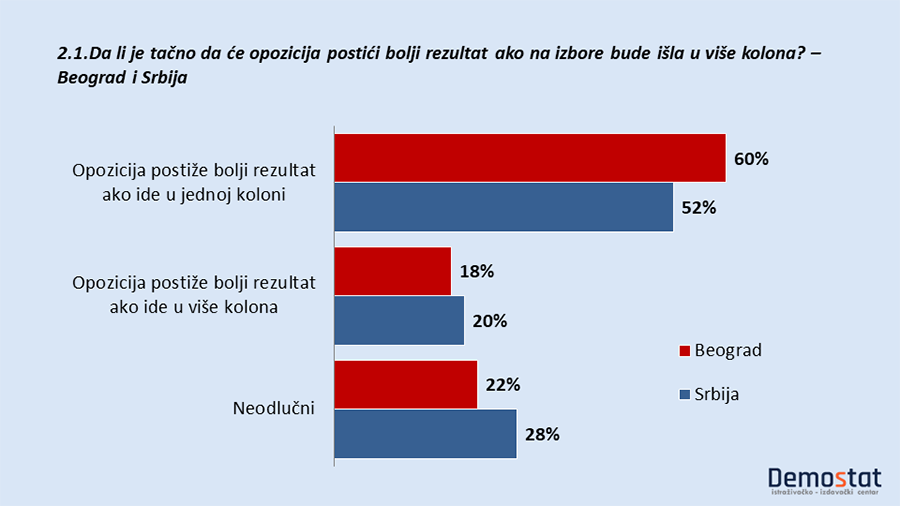Polovina Beograđana i tri petine građana Srbije smatraju da je efikasnije da opozicija ide u jednoj koloni, dok približno petina ispitanika i u jednom i u drugom uzorku podržava izlazak u više kolona (ostali su neodlučni). Većina građana je za jednu kolonu u kojoj bi bila sva opozicija. Podaci o izlaznosti i o izbornim opredeljenjima, u ovom trenutku, pokazuju da takav put vodi ka verovatnom dobijanju izbora u Beogradu i, možda, ka neizvesnom ishodu Parlamentarnih izbora. No da podsetim na jedan podatak iz letošnjeg istraživanja Demostata: blaga natpolovična većina Beograđana podržala je mišljenje da je važan dogovor opozicije a ne broj kolona!