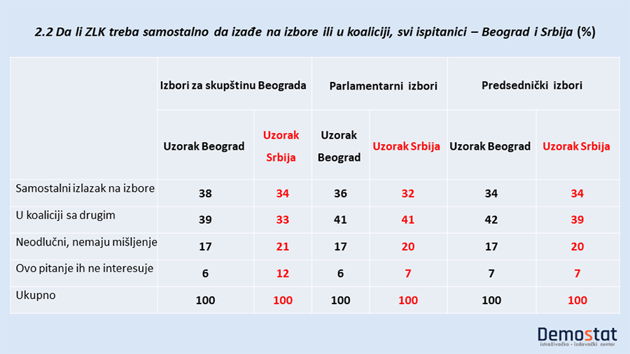 Pristalice političkog saveza u kojem su SSP, DS, NS i drugi, podeljene su oko „saveta“ za izlazak ZLK na beogradske izbore, 44% prema 44%, a u slučaju Parlamentarnih izbora prednost daju koalicijama a ne samostalnom izlasku (61% prema 32%, isto i u slučaju predsedničkih izbora 63% prema 35%).