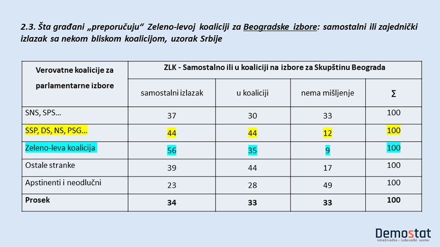 Pristalice Zeleno-leve koalicije smatraju da na izbore odbornika za Skupštinu Beograda, pre treba da izađu samostalno (56%) nego u nekoj koaliciji (35%), ta proporcija za Parlamentarne izbore iznosi 65% prema 34%, a za predsedničke izbore 61% prema 35%.