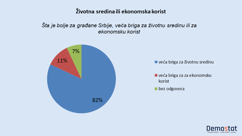 Pitali smo Beograđane šta je bolje za Srbiju, veća briga za životnu sredinu ili za ekonomsku korist bez obzira na ekološku štetu. Kao i u julskom istraživanju Demostata ogromna većina ispitanika, dala je prednost ekologiji.