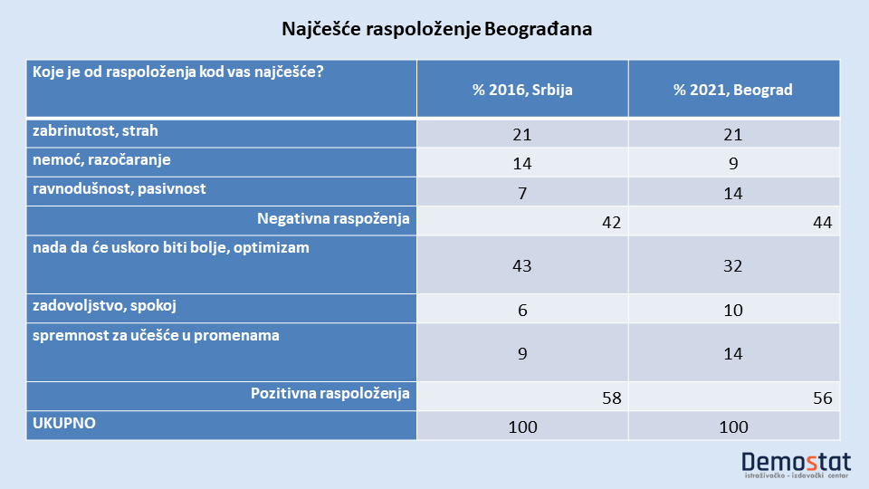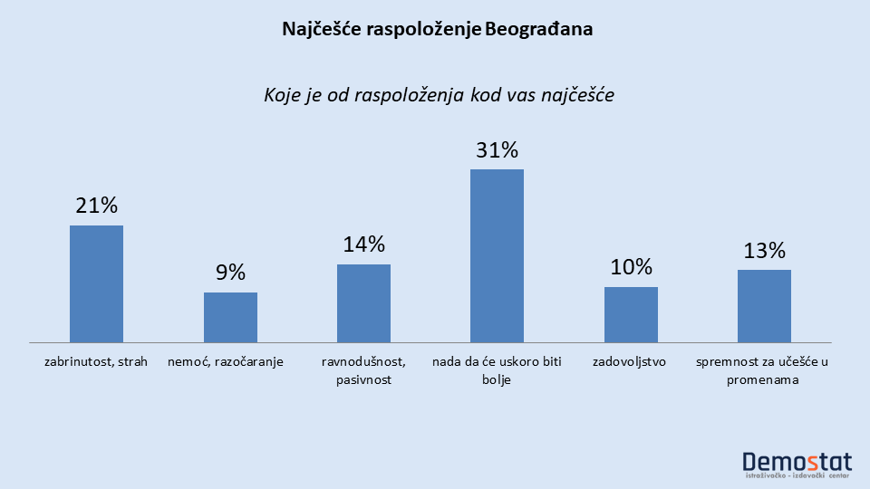 Nepuna trećina ispitanih Beograđana je da je njihovo najčešće raspoloženje vezano za nadu da će uskoro biti bolje. Na drugoj strani, petina Beograđana raspoložnje vezuje za zabrinutost i strah. Kad saberemo postotke Beograđana koji se nadaju boljitku i Beograđane koji strahuju, nalazimo da se polovina Beograđana (52%) ili nada ili se plaši.