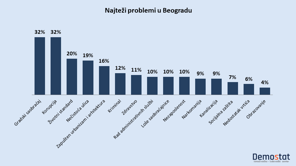 Trećina Beograđana najteži problem vidi u gradskom saobraćaju, takođe trećina problem vidi u korupciji, petina problem vezuje za životni standard a isto toliko za nečistoću Beogradskih ulica. Na petom mestu je problem koji je 16% ispitanika na otvoreno pitanje definisali kao „zapušteni urbanizam i arhitektura“. Sledi devet problema koje navodi između 6% i 12% ispitanika.