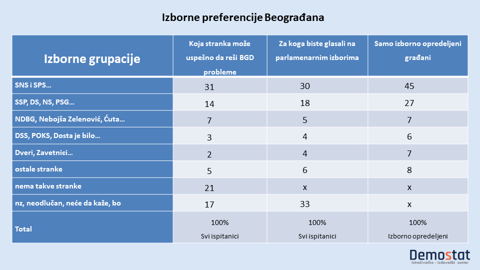 Dve petine od svih ispitanika kaže ili da ne postoji stranka koja može da reši probleme (21%) ili nije dalo odgovor ili je bilo neodlučno (17%). Ispitanici koji su odgovorili na pitanje ko bi najuspešnije rešavao beogradske probleme, podeljeni su između grupacije SNS i SPS koju je optiralo 31% ispitanika i svih ostalih grupacija za koje se opredelilo takođe 31% ispitanika. Među oponentima partija sadašnje vlasti, najviše se izdvaja grupacija SSP, DS, NS, PSG sa 14% i grupacija NDBG, Zelenović i Ćuta - 7%...