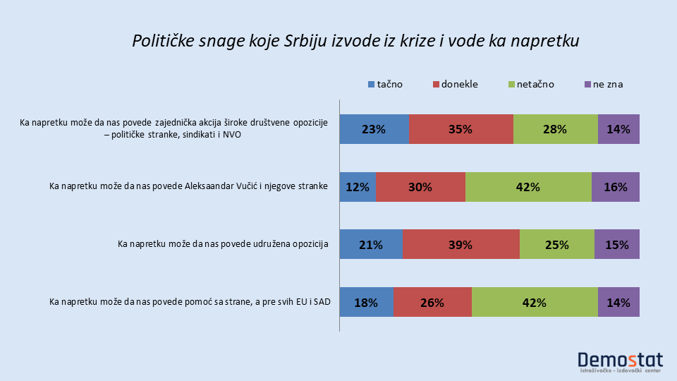 Po mišljenju natpolovičnog broja ispitanika putovođe iz ovakve Srbije su “udružene opozicione stranke” (21% kaže tačno, a 39% donekle tačno), i “zajednička akcija široke društvene opozicije – političkih partija, sindikata i NVO” (23% tačno, a 35% donekle tačno).