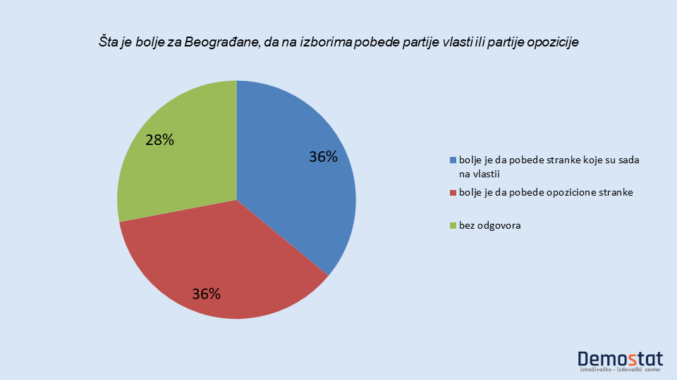 Podjednak broj Beograđana misli da je za Beograd bolje da na izborima pobede partije koje su sada na vlasti i Beograđana koji misle da je bolje za Beograd da pobedi opozicija (po 36%), a tu je i 28% onih Beograđana koji nisu odgovorili na ovo pitanje.